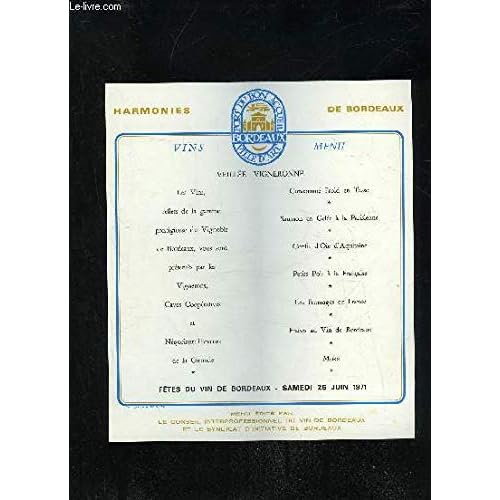 R300017389. VINS MENU HARMONIES DE BORDEAUX - FETES DU VIN DE BORDEAUX JUIN 1971. 1971. In-8. Broché. Bon état, Couv. convenable, Dos satisfaisant, Intérieur frais. 1 page.. . . . Classification Dewey : 634.8-Viticulture, vin
